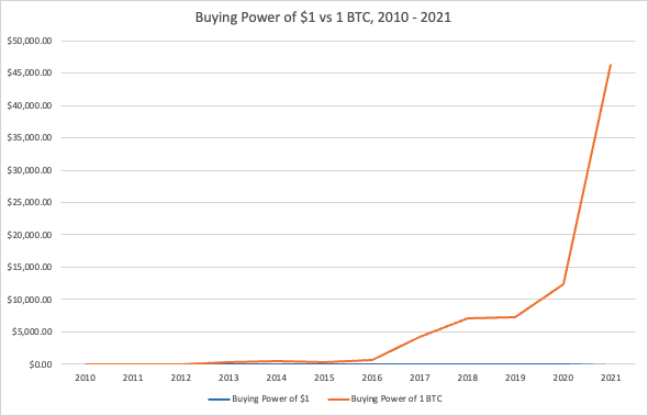 However you choose to explain the value of digital assets, Bitcoin has consistently outpaced inflation since its creation. And that’s putting it lightly. Take a look at the table and chart below to see how the purchasing power of $1 and 1 BTC has changed since 2010.